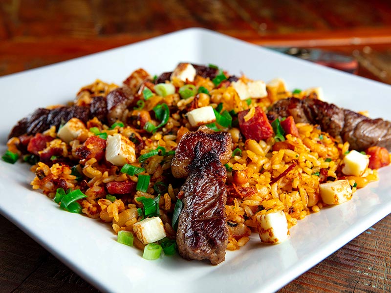 Famoso ‘‘feijão com arroz’’, carne seca desfiada, linguiça toscana, tiras de contrafilé e cubos de queijo coalho.