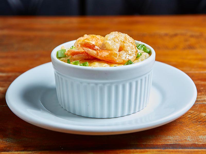 Camarão, creme de mandioquinha, catupiry e parmesão gratinado.