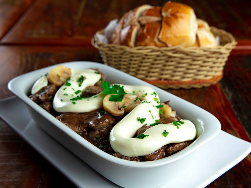 Grelhado e coberto com molho madeira. gratinado com catupiry. Acompanha pão francês.