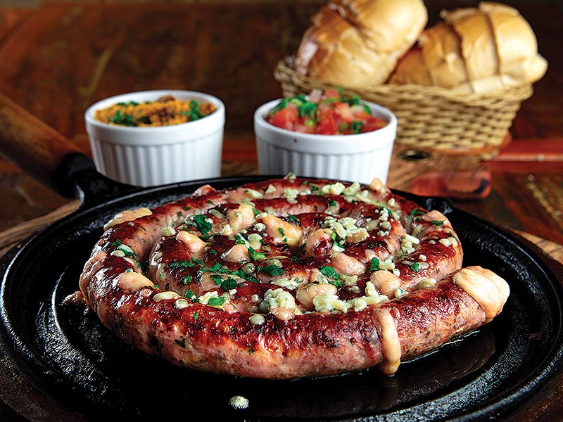 Recheada com provolone, gratinada com gorgonzola. Acompanha vinagrete, farofa e pão de alho caseiro.