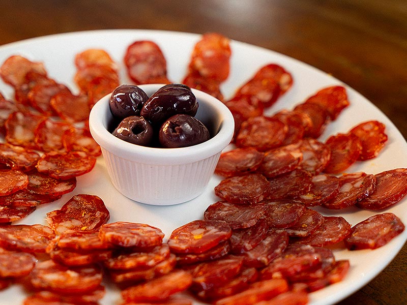 Nossa seleção de linguicinhas curadas, tradicional, pimenta e erva doce, Acompanha azeitonas pretas.