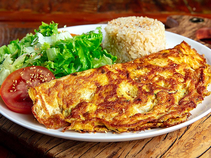 À base de ovos, cebolinha, tomates picados, cebola, cenoura e brócolis. Acompanha arroz integral e salada crua com linhaça (sem glúten).