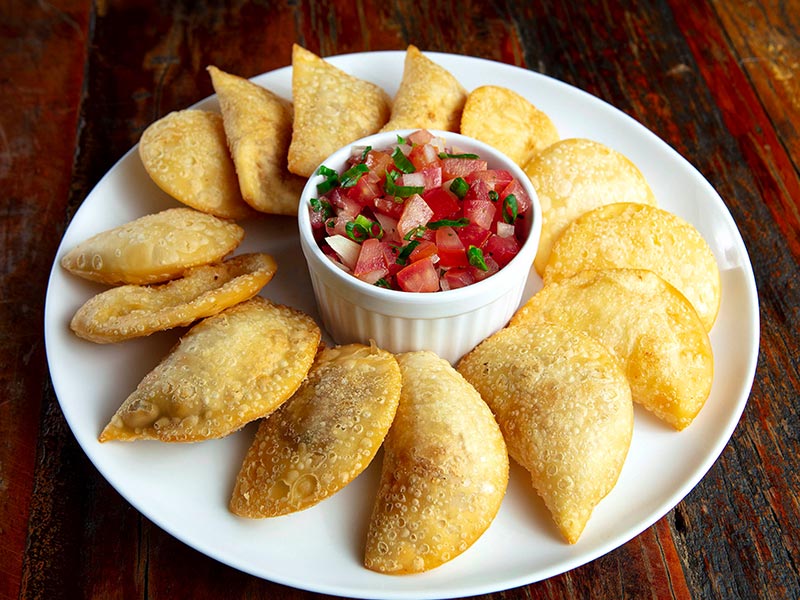 Pastéis de carne, queijo, camarão e palmito. Acompanha vinagrete.