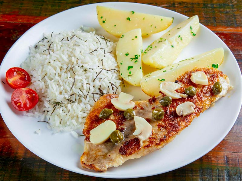 Filé de peixe grelhado com alcaparras e champignons na manteiga, servida com batatas soutê e arroz pilaf.